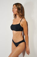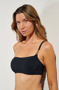 RÉSERVER EN BOUTIQUELe haut de maillot NIANIA joue d’asymétrie avec raffinement. Ce bandeau dynamise les courbes grâce aux baleines et fronces sur les côtés. Devant, une gourmette dorée révèle deux fines bretelles à nouer dans le dos pour une allure graphique et sophistiquée. Le noir, une couleur intemporelle et toujours élégante.